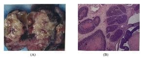 - Gross section of tumor reveals a fleshy, tan tissue with focal hemorrhage, necrosis, and cystic change